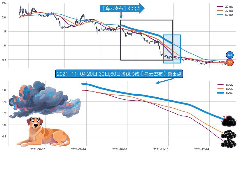 ⚀ 2021-09-10日-2022-01-06日显现 20日-30日-60日均线 【乌云密布】卖出点 看空信号,后市看跌,卖出