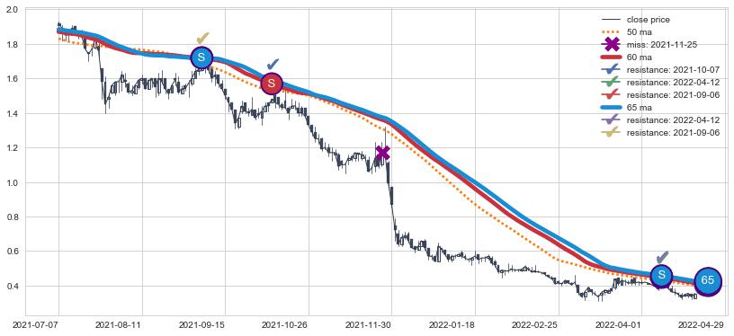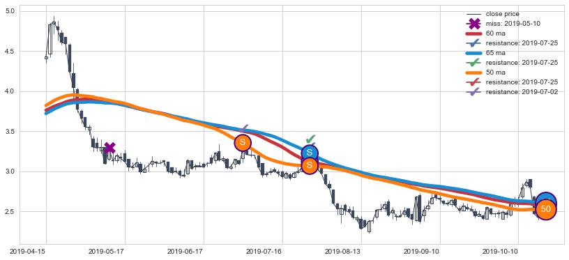 ➢ 最优均线组合共正确确认支撑阻力信号5处,正确确认率 50.00%