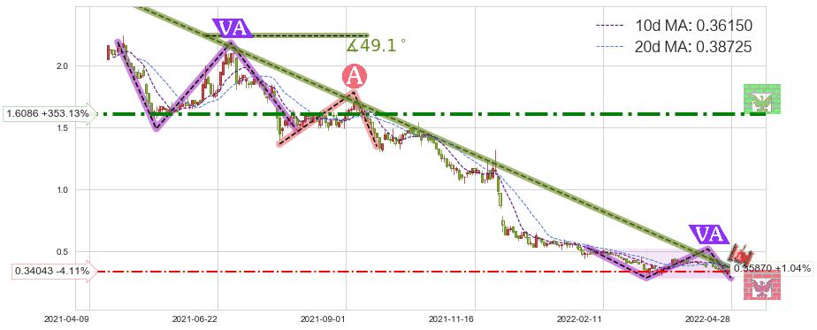 ♘ 支撑价格位0.34043,可信任强度54.71%,距离最后交易2022-04-29形成的收盘价格0.35500相差 -4.11%