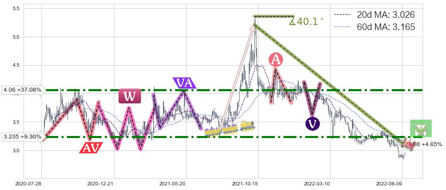 ♘ 阻力价格位3.235,可信任强度76.12%,距离最后交易2022-08-12形成的收盘价格2.960相差 +9.30%
