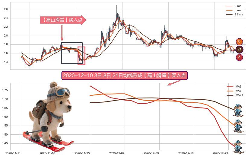 ⚀ 2020-11-25日-2020-12-24日显现 3日-8日-21日均线 【高山滑雪】买入点 看多信号,后市看涨,买入
