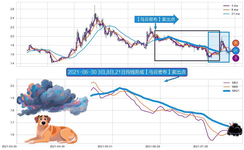 ⚀ 2021-05-17日-2021-08-11日显现 3日-8日-21日均线 【乌云密布】卖出点 看空信号,后市看跌,卖出