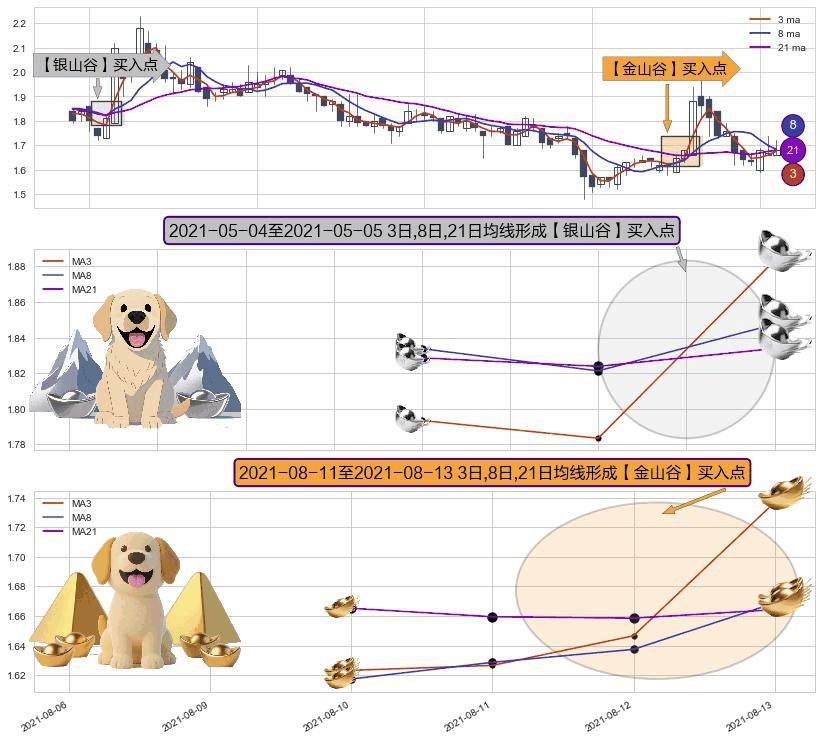 ⚃ 2021-08-12-日至2021-08-13-日显现 3日-8日-21日均线 【金山谷】买入点 其再次确认了买入信号,可靠性更强,买入