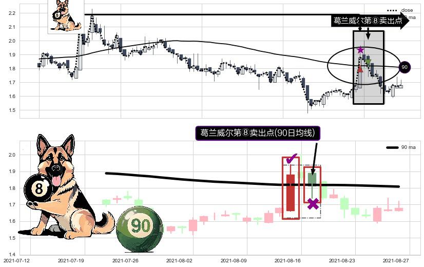 ⚀ 2021-08-17-日显现 葛兰威尔均线 90日均线 第⑧卖出点 下降趋势的中继信号,后市看跌,卖出信号