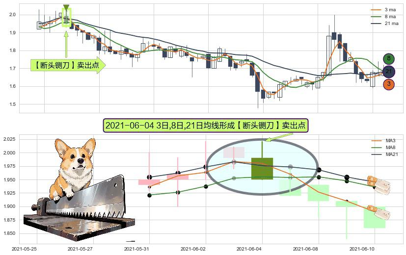 ⚀ 2021-06-04日显现 3日-8日-21日均线 【断头铡刀】卖出点 看空信号,后市看跌,卖出