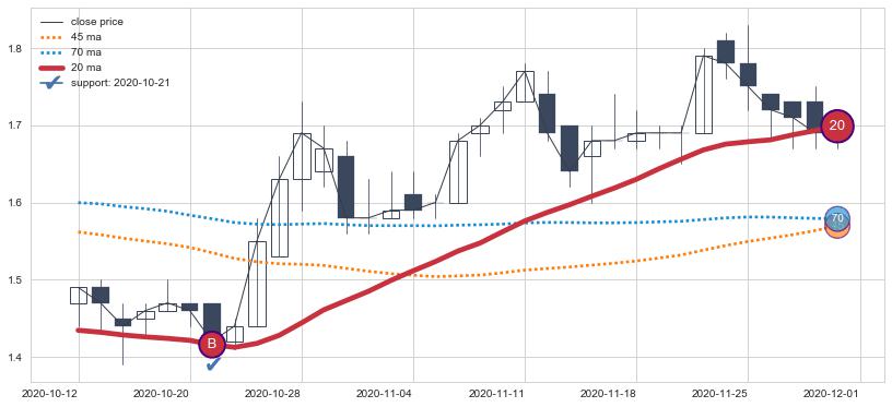 ⚀ 中期均线MA8上穿长期均线MA21形成的交叉是标准 黄金交叉