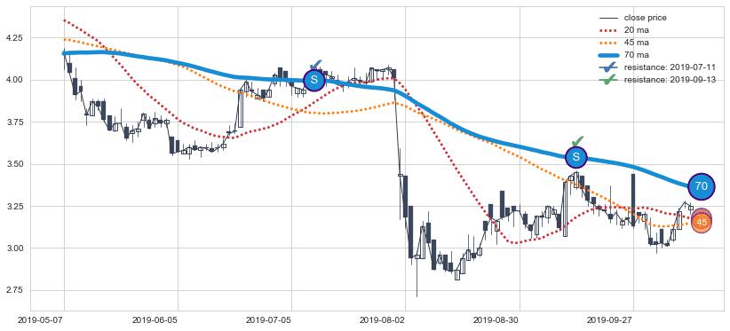 ➢ 最优均线组合共正确确认支撑阻力信号9处,正确确认率 64.29%