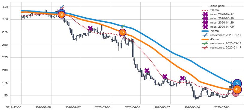 ⚄ 均线向上突破后价格上探力度低,正乖离率低,再次向下破位后维持原均线下跌趋势【强】