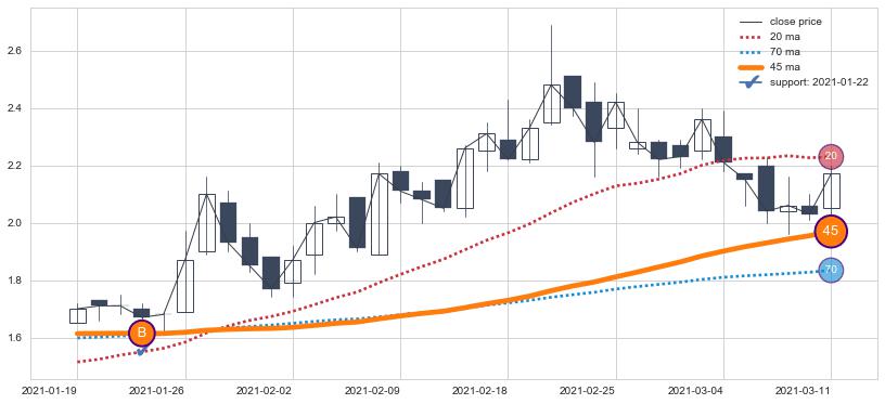 ⚁ MA3和MA8走势平行,且始终保持在短距离内,MA21始终在短中期均线上方,与短中期均线保持一定的距离,微微下行