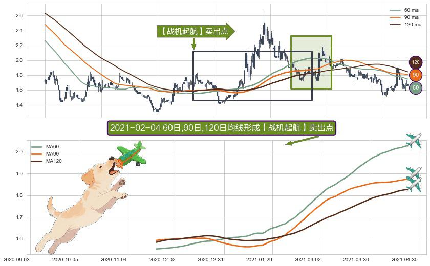 ⚀ 2020-11-20日-2021-04-26日显现 60日-90日-120日均线 【战机起航】卖出点 看空信号,后市看跌,卖出