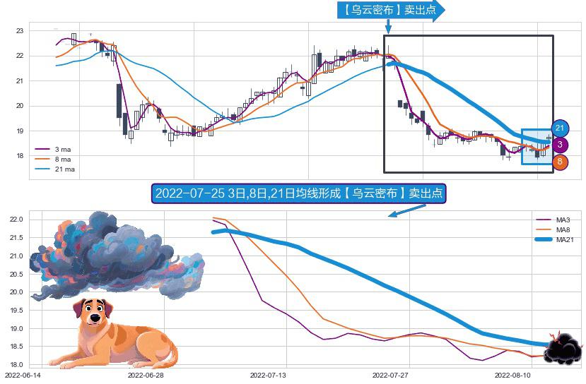 ⚀ 2022-07-05日-2022-08-12日显现 3日-8日-21日均线 【乌云密布】卖出点 看空信号,后市看跌,卖出