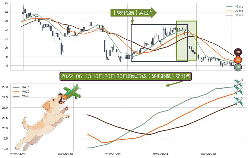 ⚀ 2022-05-19日-2022-07-05日显现 10日-20日-30日均线 【战机起航】卖出点 看空信号,后市看跌,卖出