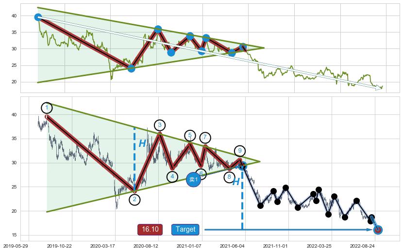 ➢ 最小中继整理跌幅→𝐇: 13.29 (低点逐步抬高斜边第一支撑点②与阻力边垂直距离)