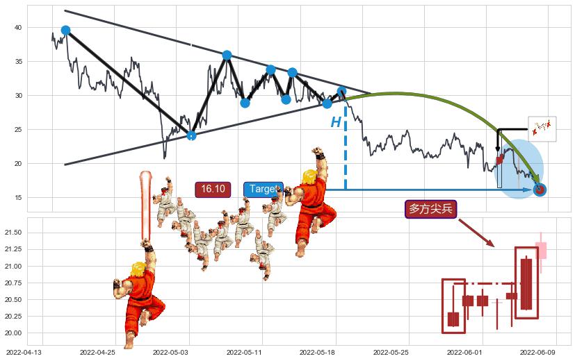 | 14 🅚:锤头线(锤子线) ➕ 📐:下降对称三角整理猜想预期下跌目标target即将达成,随后猜想强支撑来临,预期反弹上涨(均值回复) ☞ 看多信号 ⇥ 【🅚线】交织【图形】⇥ 综合量化分数: 53 | > |