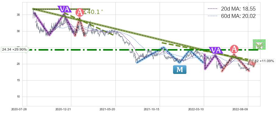 ♘ 在最后的下跌阶段2020-08-17至2022-08-12,存在 持续未破位的阻力位 ,阻力价格20.82,可信任强度87.83%,其距离最后价格18.74相差 +11.09%