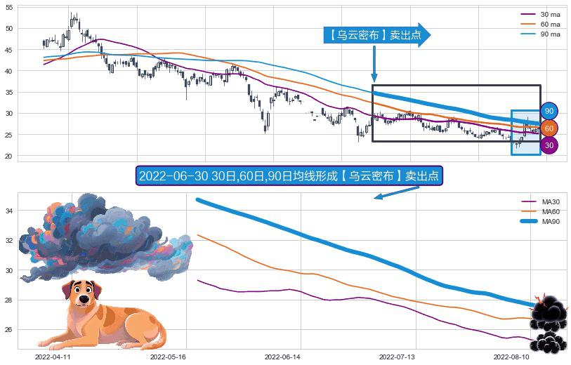 ⚀ 2022-05-18日-2022-08-12日显现 30日-60日-90日均线 【乌云密布】卖出点 看空信号,后市看跌,卖出