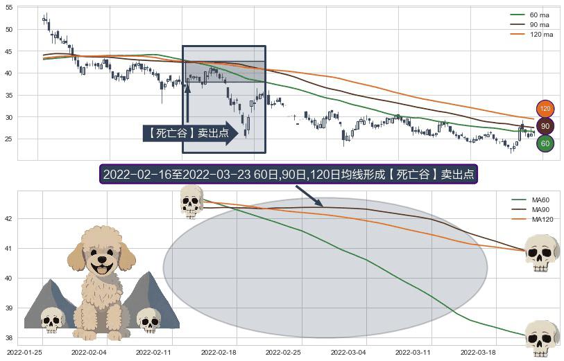 ⚀ 2022-02-17-日至2022-03-23-日显现 60日-90日-120日均线 【死亡谷】卖出点 看空信号,后市看跌,卖出