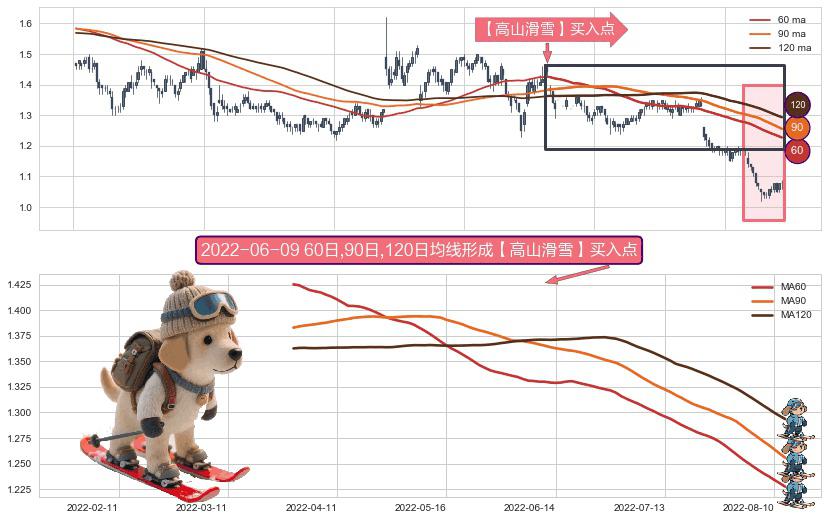 形态多维评估: ⚀ 2022-03-29日-2022-08-12日显现 60日-90日-120日均线 【高山滑雪】买入点 看多信号,后市看涨,买入