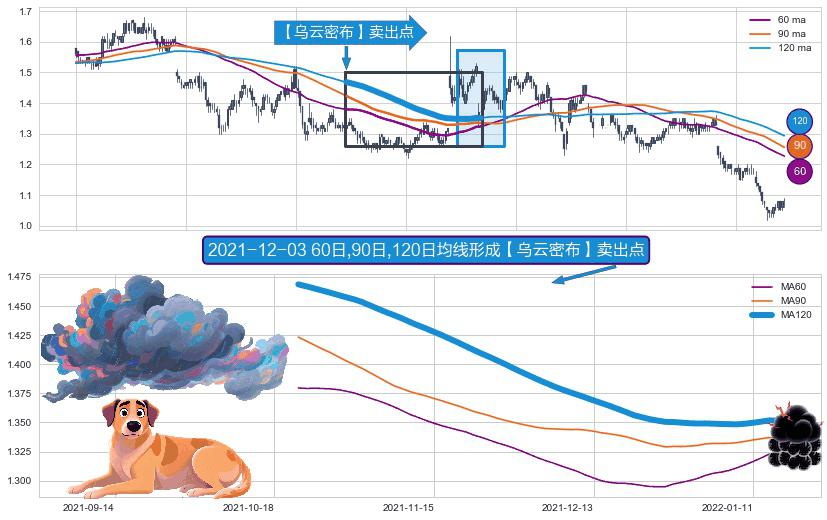 形态多维评估: ⚀ 2021-10-21日-2022-01-17日显现 60日-90日-120日均线 【乌云密布】卖出点 看空信号,后市看跌,卖出