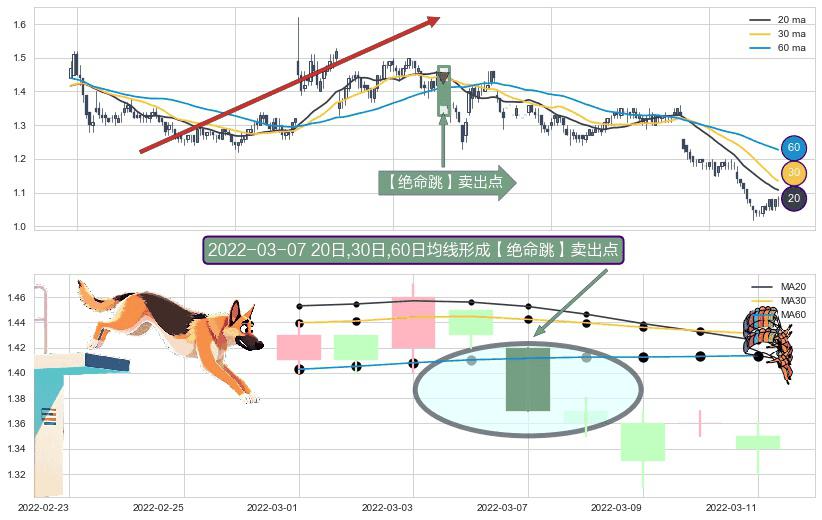 形态多维评估: ⚀ 2022-03-07日显现 20日-30日-60日均线 【绝命跳】卖出点 看空信号,后市看跌,卖出