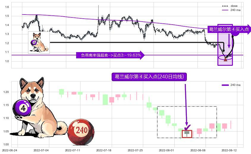 形态多维评估: ⚀ 2022-08-03-日显现 葛兰威尔均线 240日均线 第④买入点 下降趋势均值回复的短线反弹信号,后市看涨,买进信号