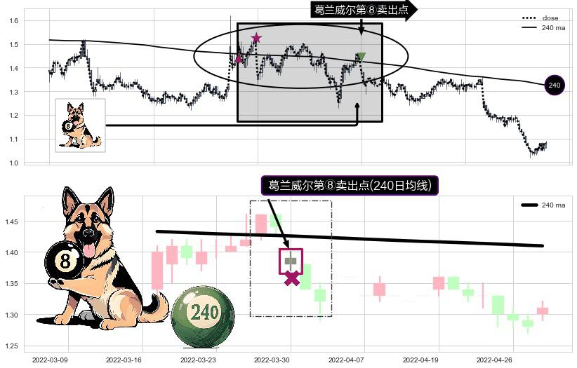形态多维评估: ⚀ 2022-03-30-日显现 葛兰威尔均线 240日均线 第⑧卖出点 下降趋势的中继信号,后市看跌,卖出信号
