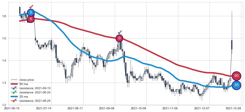 下跌趋势2021-06-15-2021-12-28,均线90, 35确认关键阻力2处