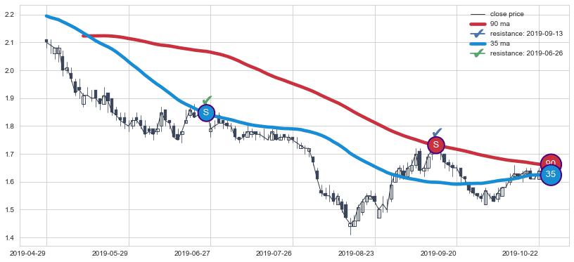下跌趋势2019-04-29-2019-10-23,均线90, 35确认关键阻力2处