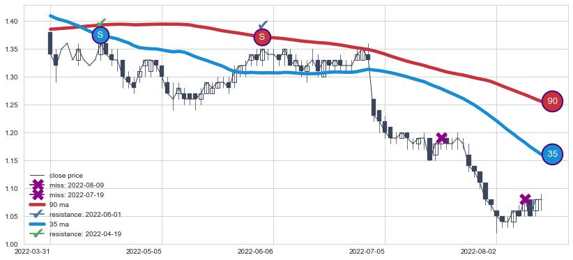 下跌趋势2022-03-31-2022-08-12,均线90, 35确认关键阻力2处