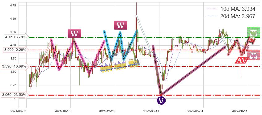 ♘ 阻力价格位4.15,可信任强度59.00%,距离最后交易2022-08-12形成的收盘价格4.00相差 +3.78%