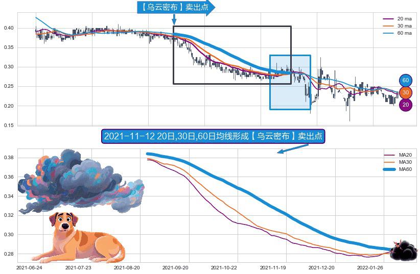 ⚀ 2021-08-25日-2022-02-09日显现 20日-30日-60日均线 【乌云密布】卖出点 看空信号,后市看跌,卖出