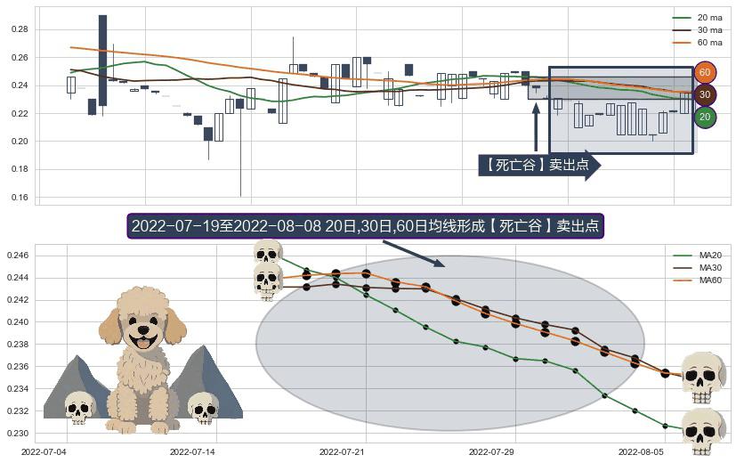 ⚀ 2022-07-20-日至2022-08-08-日显现 20日-30日-60日均线 【死亡谷】卖出点 看空信号,后市看跌,卖出