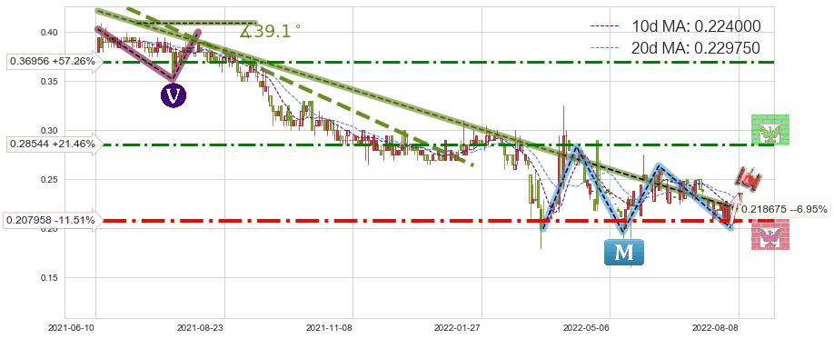 ♘ 阻力价格位0.36956,可信任强度62.53%,距离最后交易2022-08-10形成的收盘价格0.235000相差 +57.26%