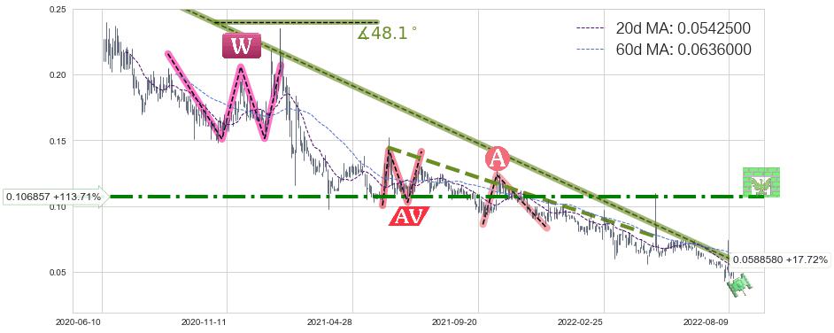 ♘ 在最后的下跌阶段2020-06-12至2022-08-12,存在 持续未破位的阻力位 ,阻力价格0.0588580,可信任强度88.65%,其距离最后价格0.0500000相差 +17.72%