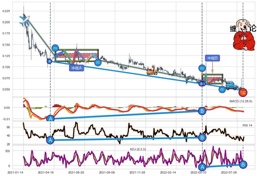 ➣ 【中枢B】:2022-05-05-2022-06-13,中枢由4笔构成,共23交易日, ZG=0.0740000, ZD=0.0670000