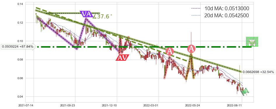 ♘ 在最后的下跌阶段2021-07-19至2022-08-12,存在 持续未破位的阻力位 ,阻力价格0.0662698,可信任强度88.58%,其距离最后价格0.0500000相差 +32.54%