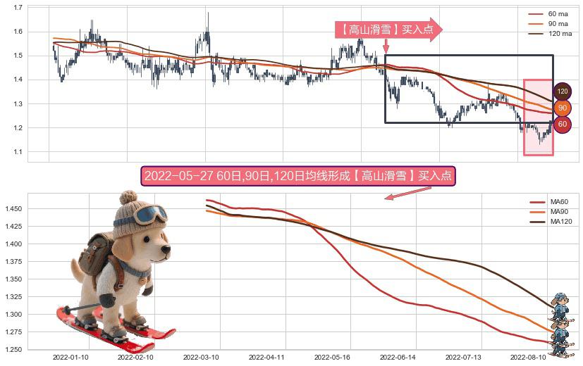 ⚀ 2022-03-04日-2022-08-12日显现 60日-90日-120日均线 【高山滑雪】买入点 看多信号,后市看涨,买入