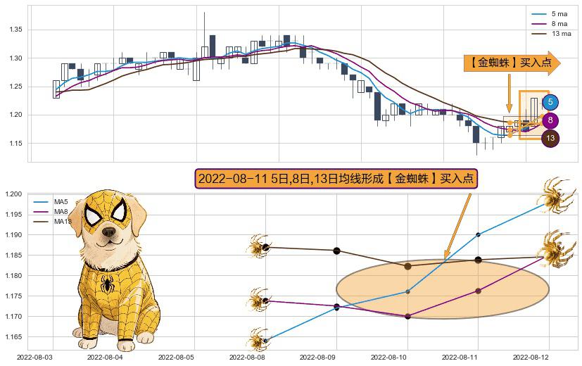 ⚀ 2022-08-11日显现 5日-8日-13日均线 【金蜘蛛】买入点 看多信号,后市看涨,买入