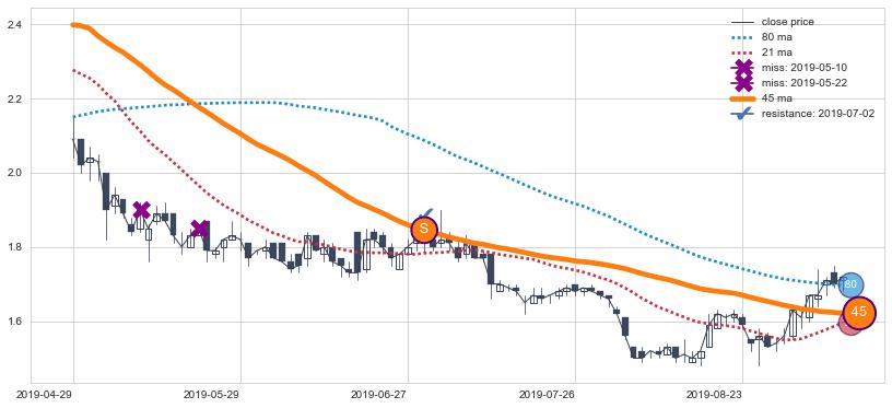 ⚄ 均线向上突破后价格上探力度低,正乖离率低,再次向下破位后维持原均线下跌趋势【强】