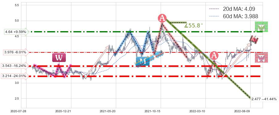 ♘ 支撑价格位3.976,可信任强度42.05%,距离最后交易2022-08-12形成的收盘价格4.23相差 -6.01%