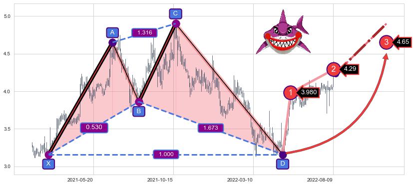➣ 已完成【鲨鱼】形态起点X: 2021-02-25, 终点D: 2022-05-10, 共294交易日