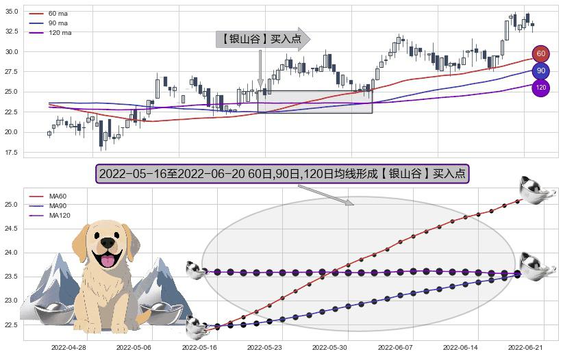形态多维评估: ⚀ 2022-05-17-日至2022-06-20-日显现 60日-90日-120日均线 【银山谷】买入点 看多信号,后市看涨,买入