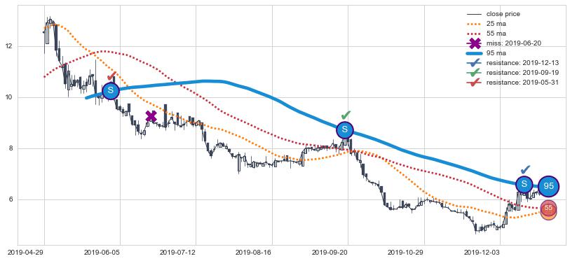 下跌趋势2019-04-29-2019-12-20,均线95确认关键阻力3处
