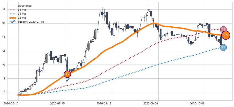 上涨趋势2020-06-15-2020-10-21,均线25确认关键支撑1处