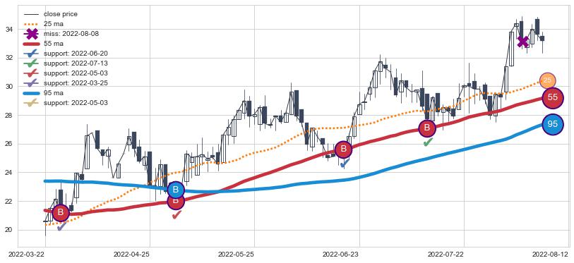 上涨趋势2022-03-22-2022-08-12,均线95, 55确认关键支撑4处