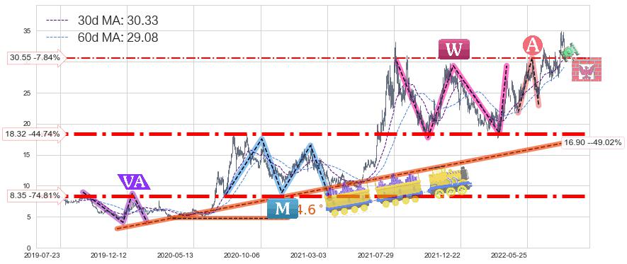 ♘ 支撑价格位30.55,可信任强度52.36%,距离最后交易2022-08-12形成的收盘价格33.15相差 -7.84%