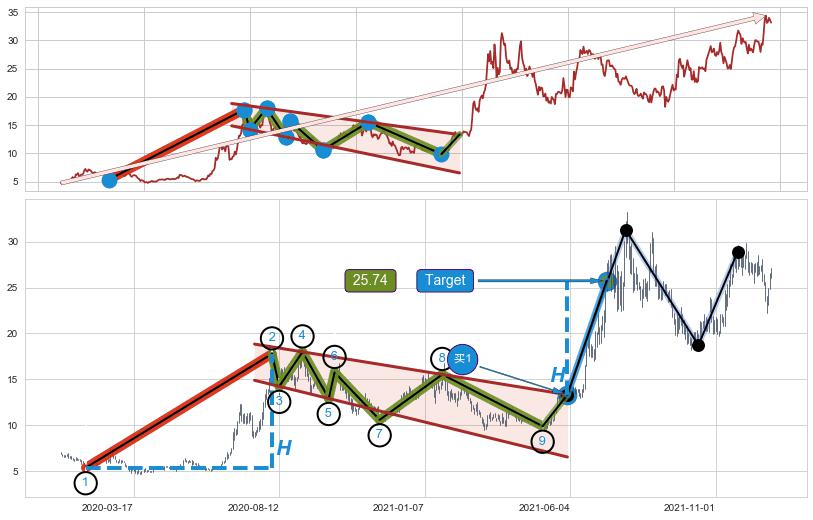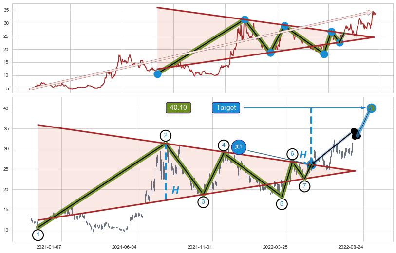 ➢ 最小中继整理涨幅→𝐇: 14.03 (高点逐步降低斜边第一阻力点②与支撑边垂直距离)