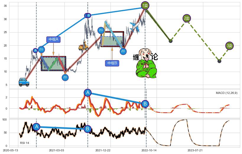 ➣ 【中枢B】:2021-10-26-2022-03-15,中枢由4笔构成,共97交易日, ZG=23.35, ZD=19.94