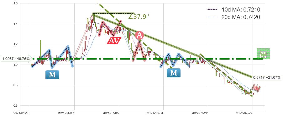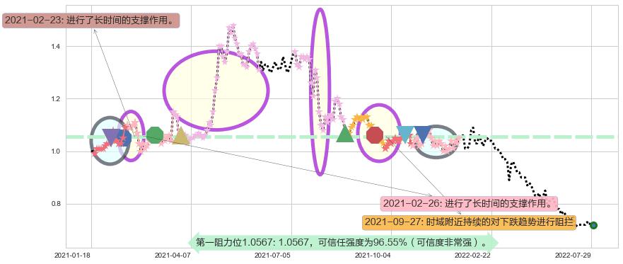 ♘ 在最后的下跌阶段2021-05-07至2022-07-29,存在 持续未破位的阻力位 ,阻力价格0.8717,可信任强度81.71%,其距离最后价格0.7200相差 +21.07%