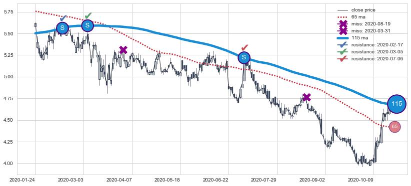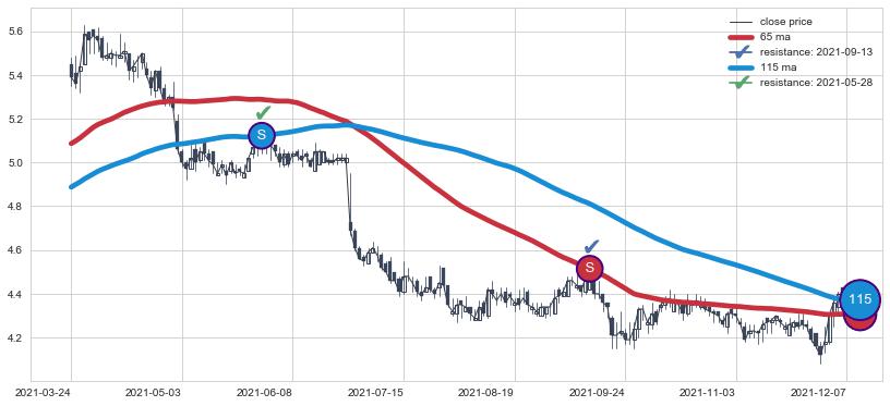 下跌趋势2021-03-24-2021-12-07,均线65, 115确认关键阻力2处